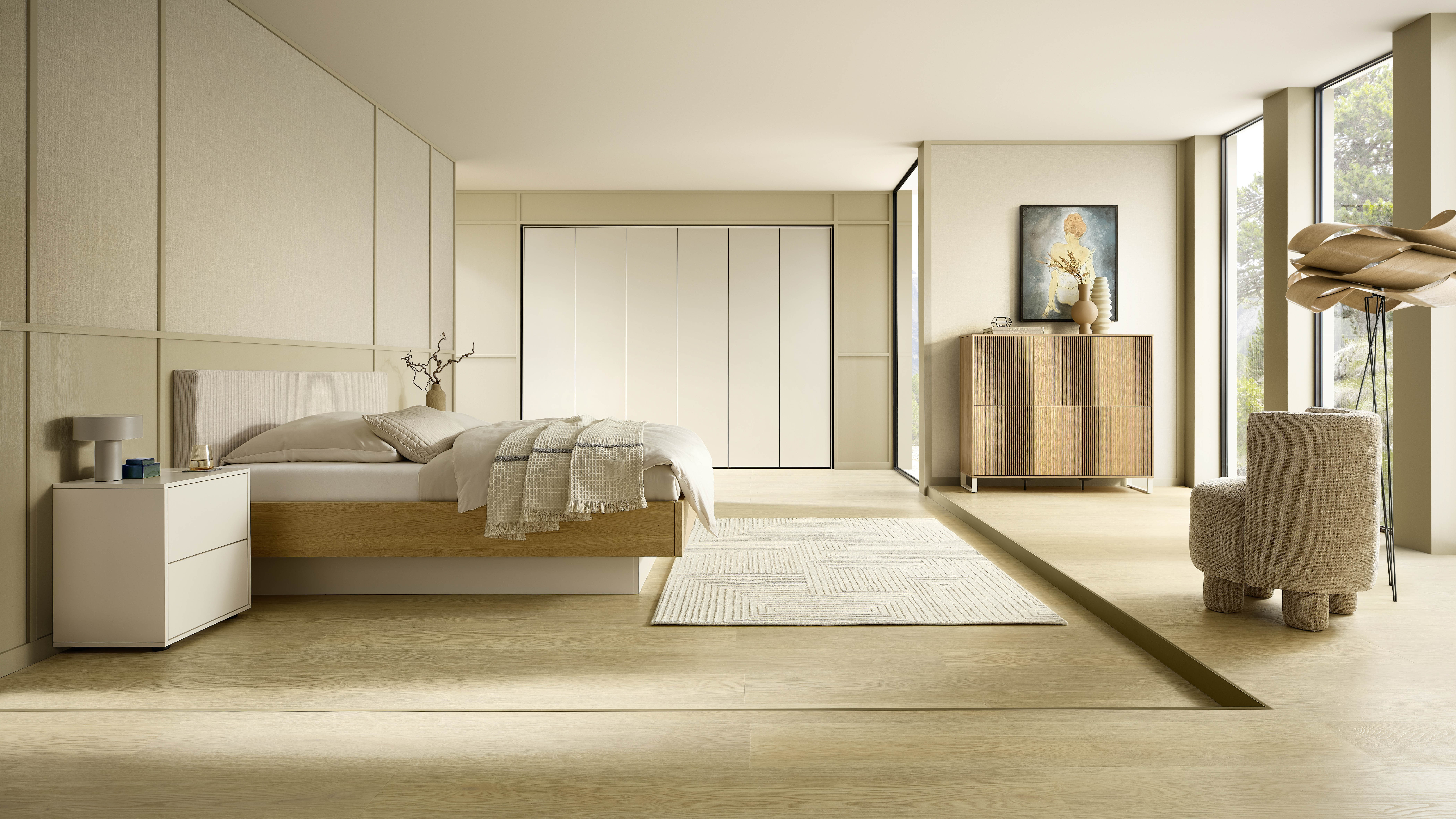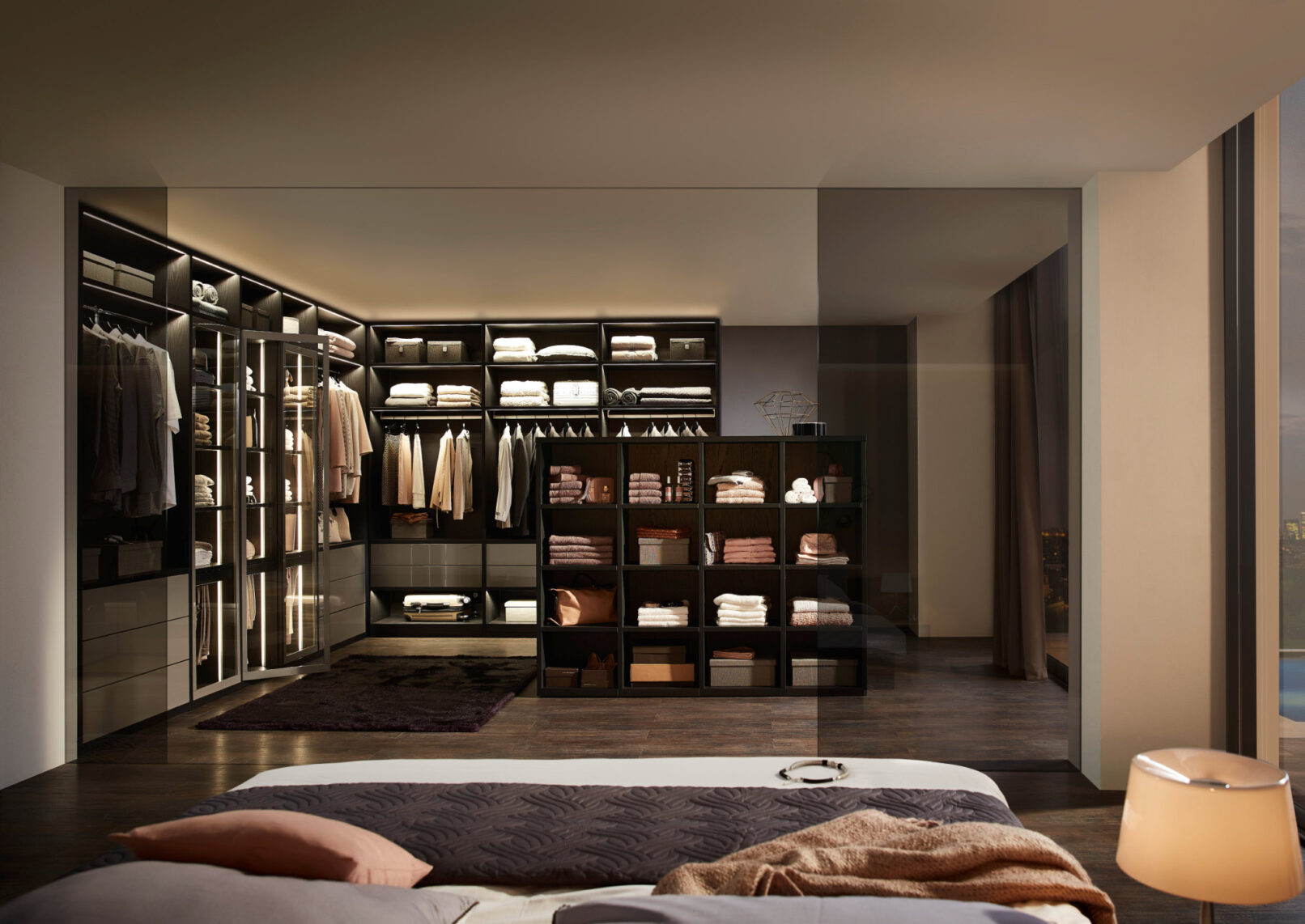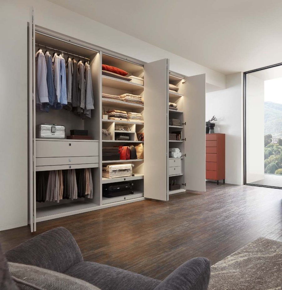 Pull-down rails, multi-use hooks, adjustable dividers — each component thought through so the space doesn’t have to be. Everything in its place. The room, undisturbed.