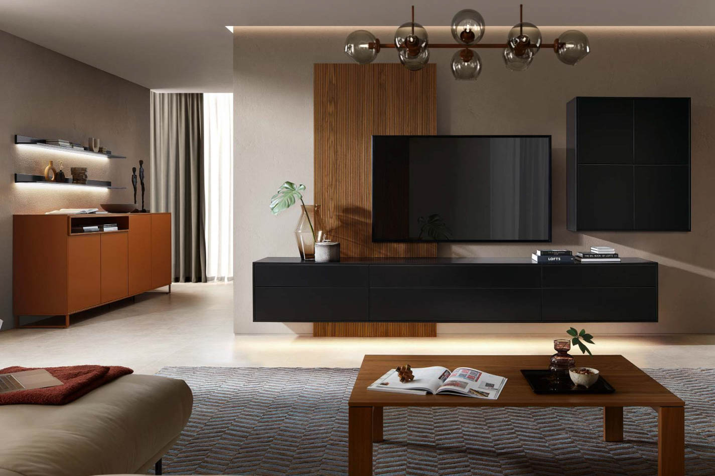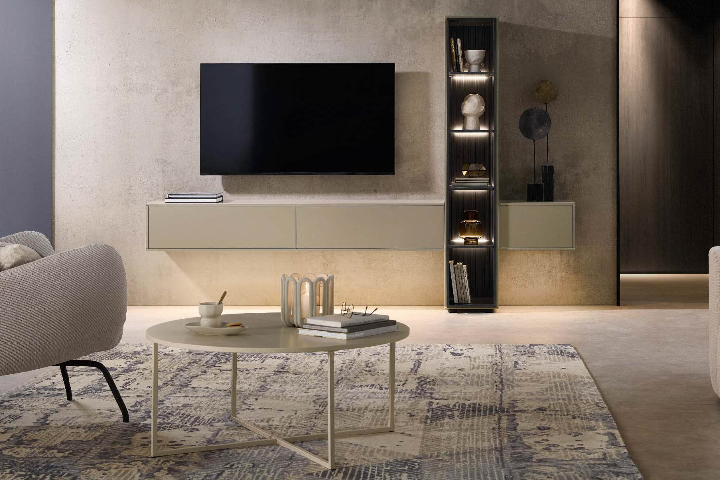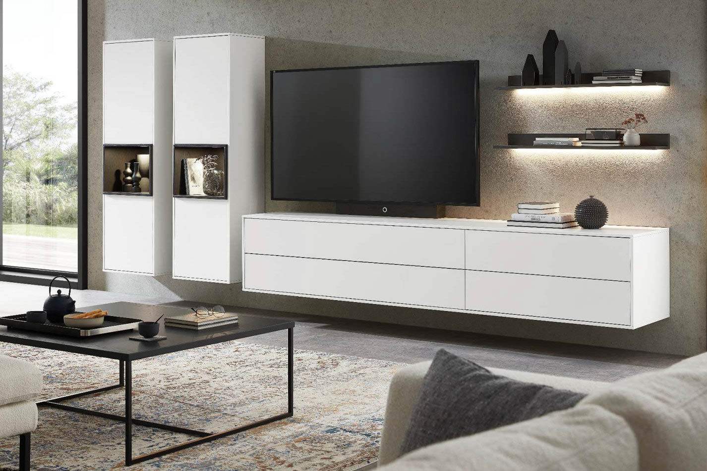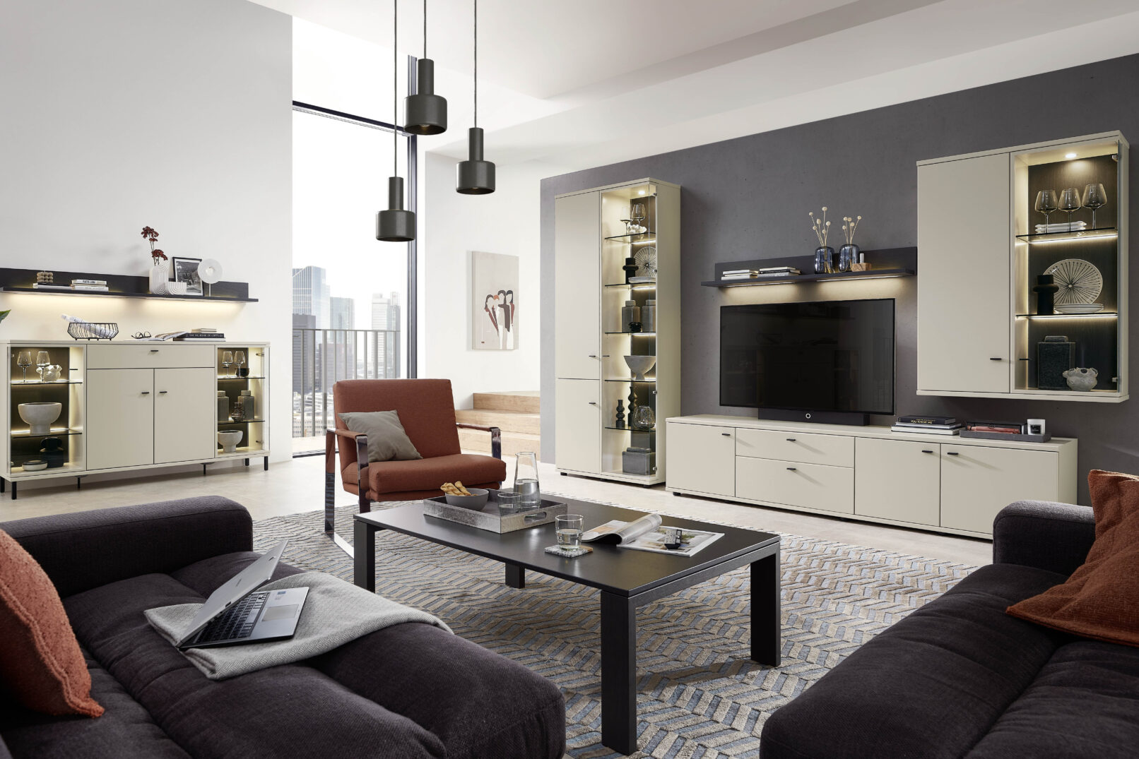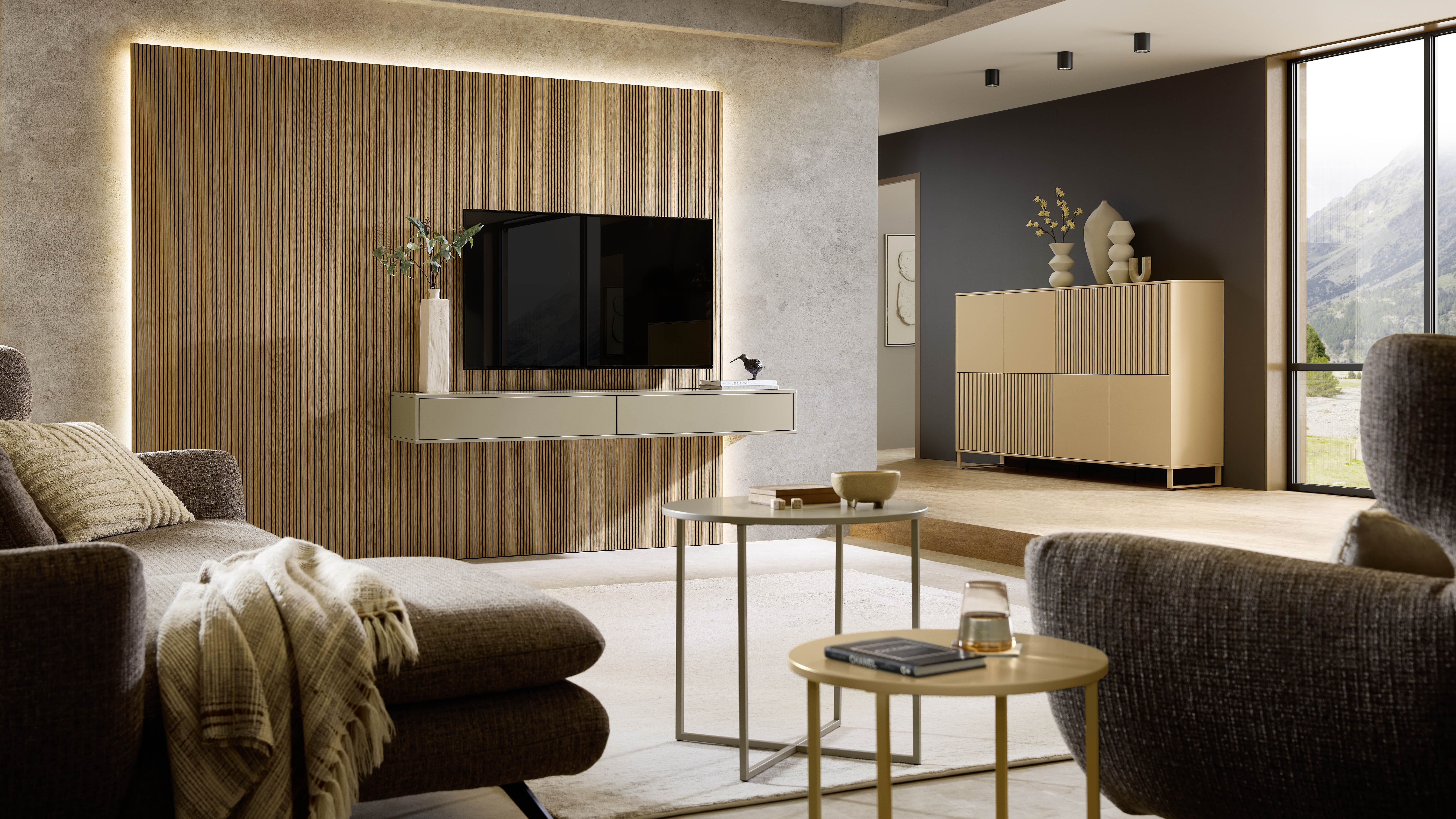HARMONY hiểu điều đó. Tủ sideboard trượt nhẹ ra làm vách ngăn khi cần, tủ kính trưng bày những vật dụng yêu thích dưới ánh đèn LED dịu. Phần nhô (Nischenelement) vừa đủ để màu sắc có tiếng nói, không đủ để lấn át tổng thể. Chân kim loại thanh mảnh giữ cho nội thất bay nhẹ trên mặt sàn. HARMONY là phòng khách của người biết mình muốn gì — và biết cách để không gian thể hiện điều đó một cách tự nhiên.
