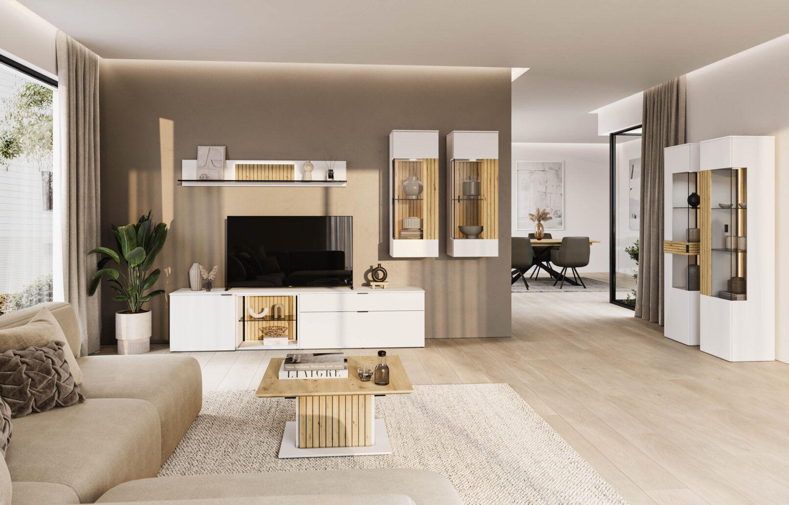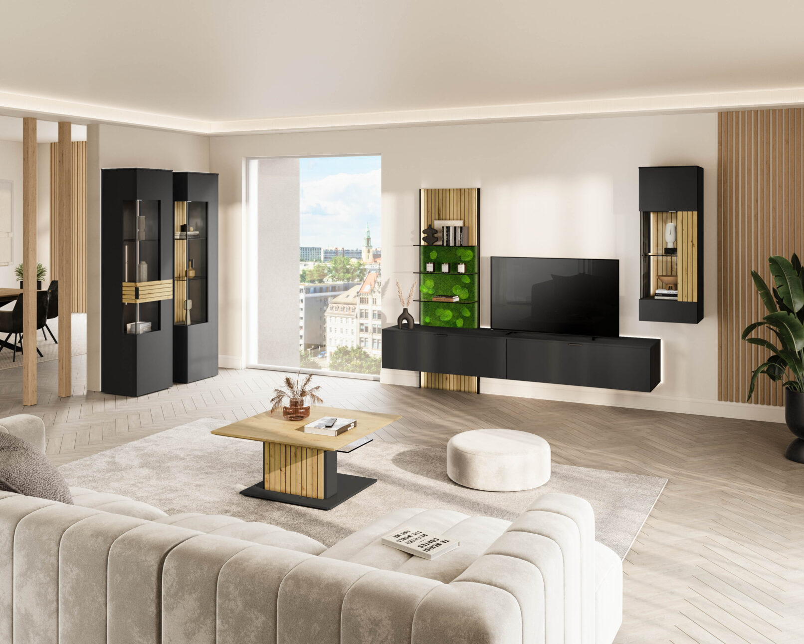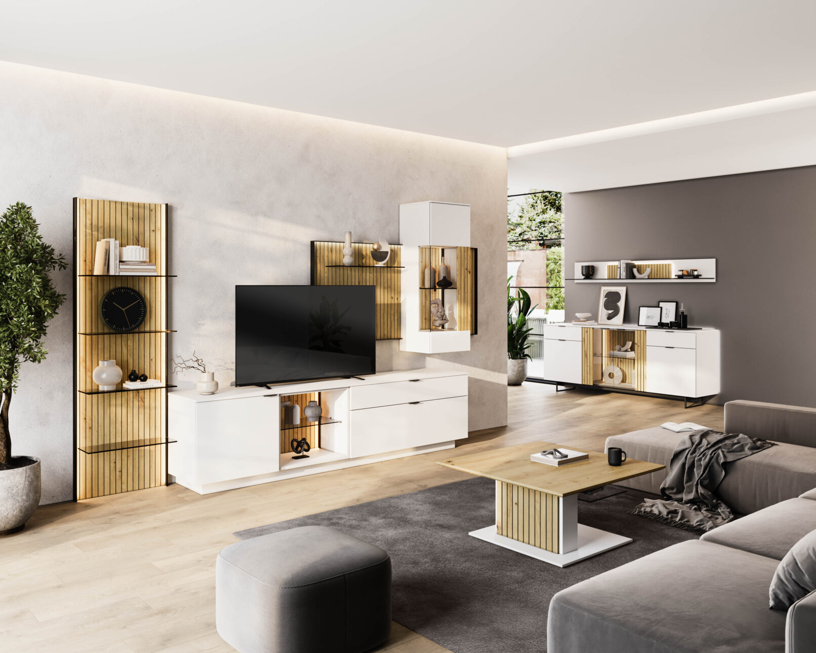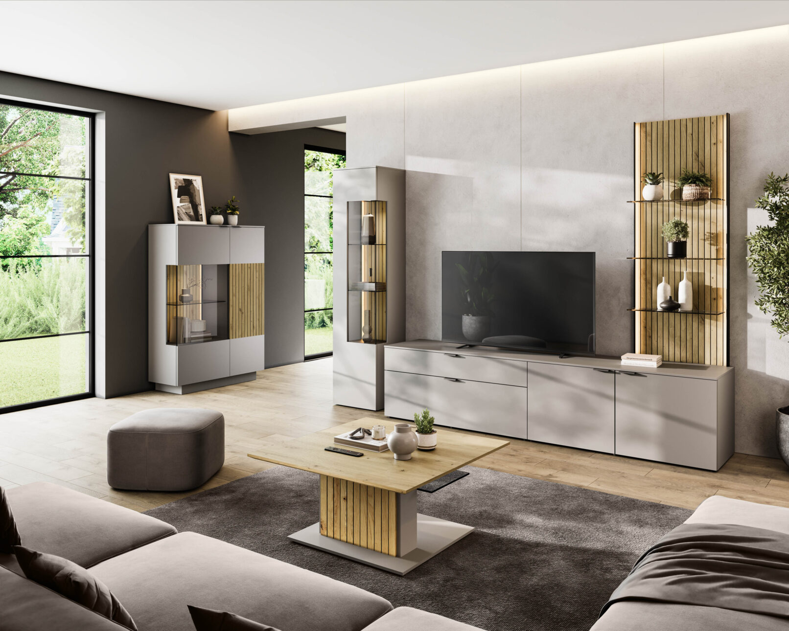 Linera represents a harmonious symbiosis of sophisticated lacquer with modern wooden slats that exude natural elegance. As part of this uniquely refined piece, the wooden slats are milled by our wood specialists using beautiful wild oak or natural walnut veneer to create a high-quality yet wonderfully easy-care texture. When combined with lacquer, the result is an urban-chic room concept radiating natural warmth and modernity.