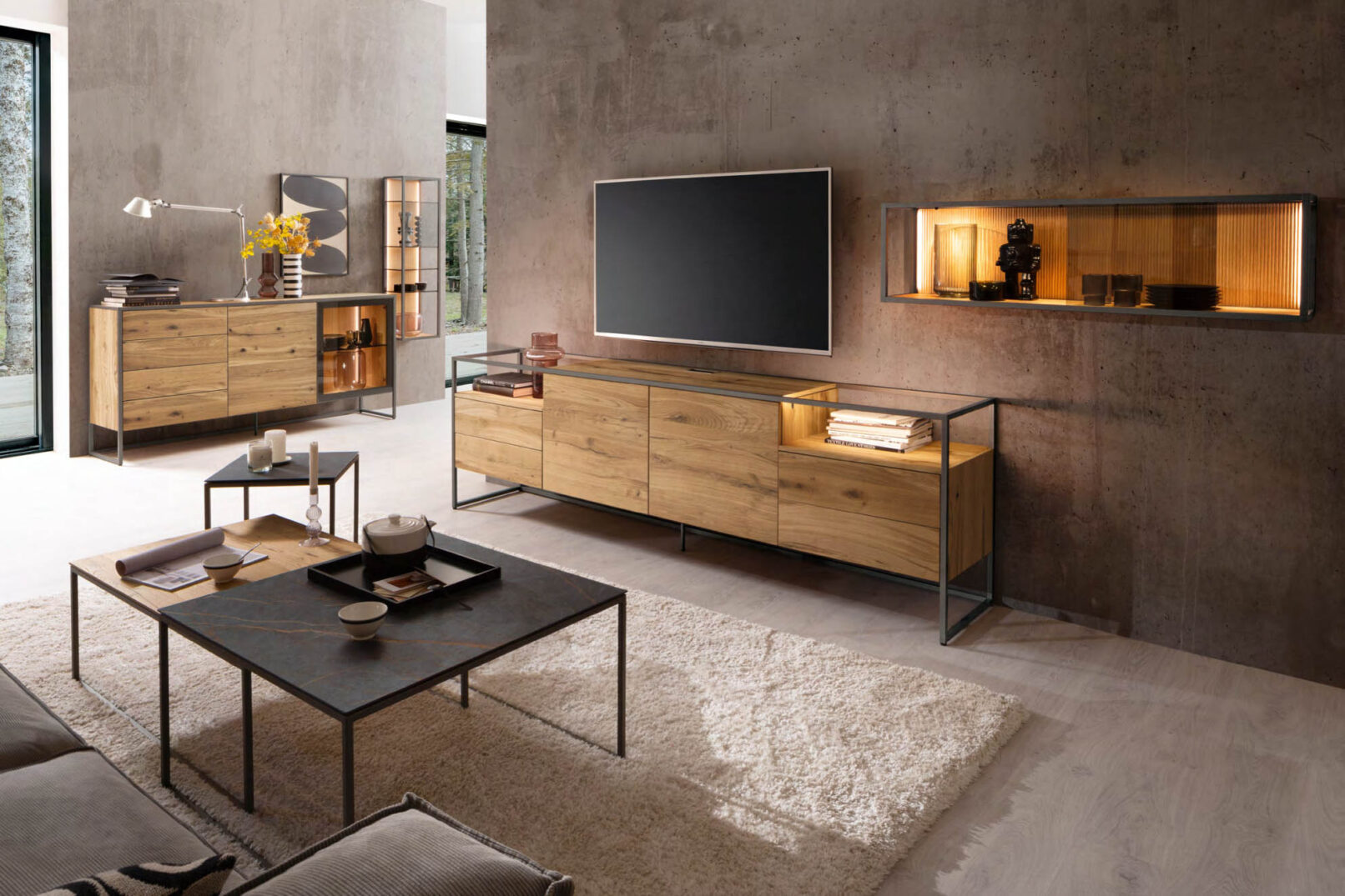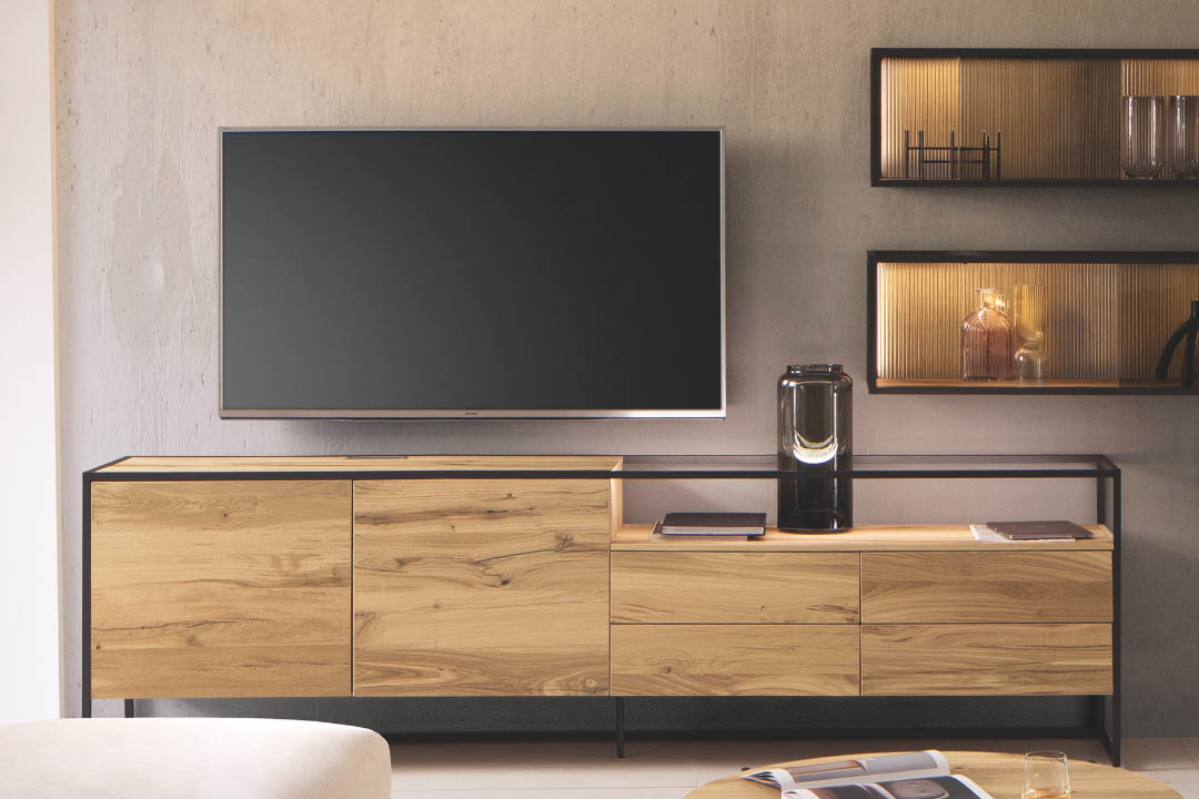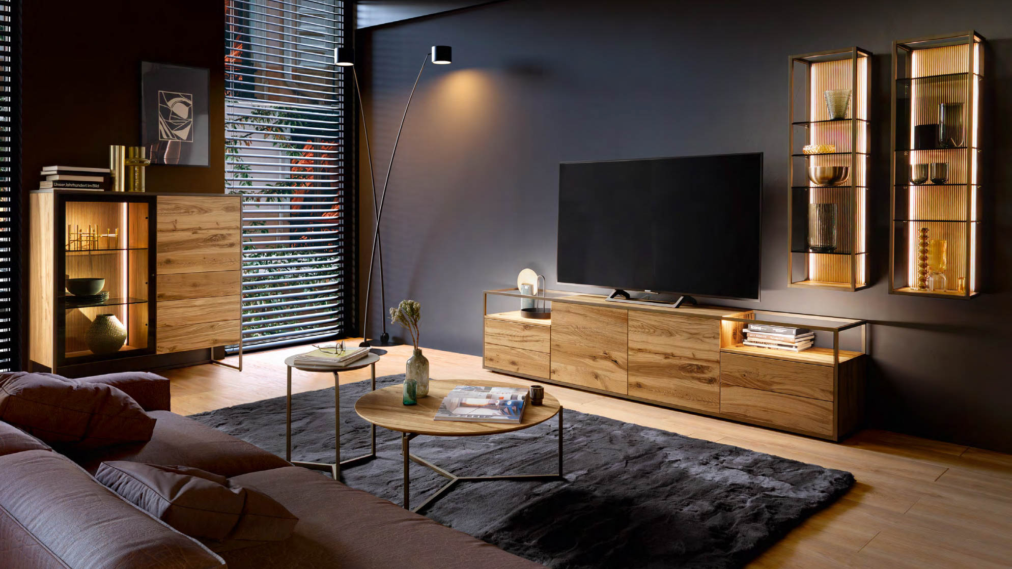 Khung kim loại sepia matt của TAGENA mỏng đến mức gần như biến mất — nhưng chính nó định hình cả bộ sưu tập phòng khách này. Kệ treo không chạm sàn, cửa kính Parsol xám lọc ánh sáng vừa đủ, đèn LED dọc kéo không gian lên cao. Gỗ sồi dầu thủ công là hơi ấm nền mà cả phòng khách tựa vào — không phô, không ẩn, chỉ đúng chỗ.