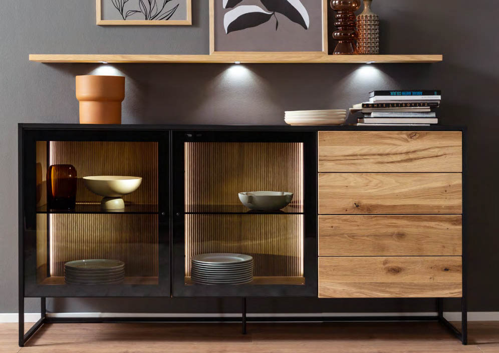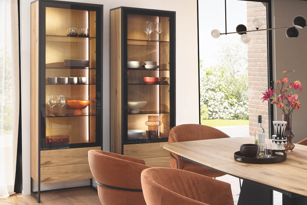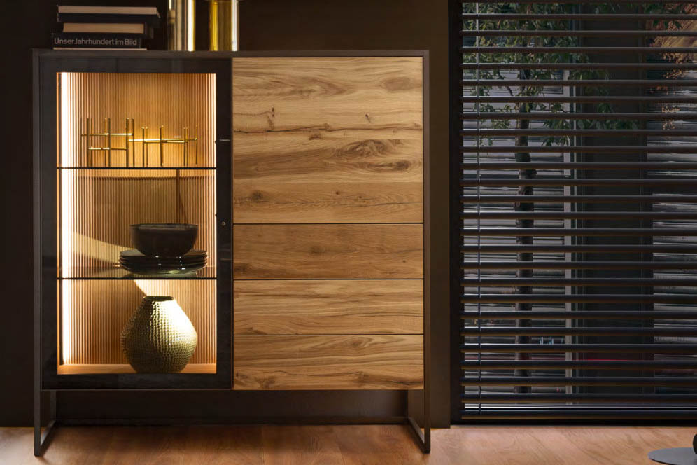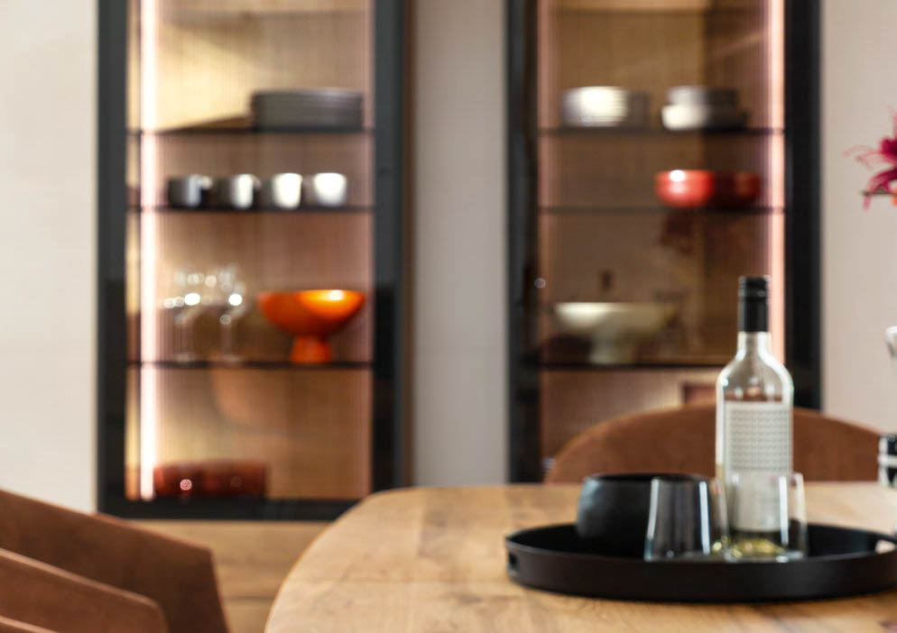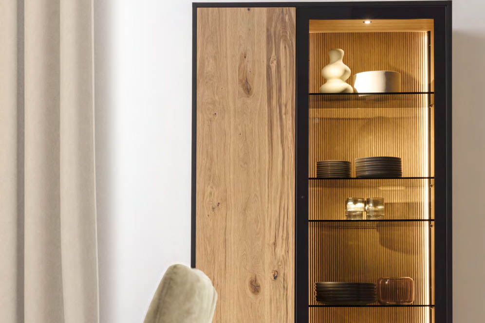 TAGENA lấy cảm hứng từ thiên nhiên, không phải bằng cách tái hiện nó, mà bằng cách tôn trọng nó. Gỗ sồi được phủ dầu thủ công, giữ nguyên vẻ đẹp tự nhiên của thớ gỗ. Khung kim loại filigree sepia matt mỏng, tạo nên ngôn ngữ thiết kế riêng biệt mà không lấn át chất liệu gỗ. Mặt trong tủ kính được xử lý vân rãnh nổi, đèn LED điều chỉnh được, cửa push-to-open, mỗi chi tiết là một lựa chọn có chủ ý. TAGENA là dòng nội thất cho những không gian biết cân bằng giữa ấm áp và tinh tế.